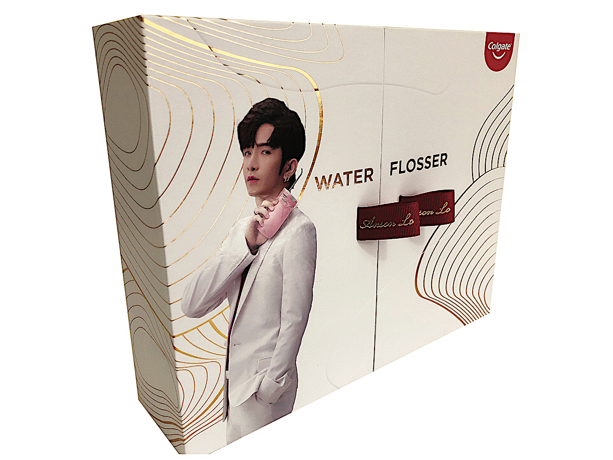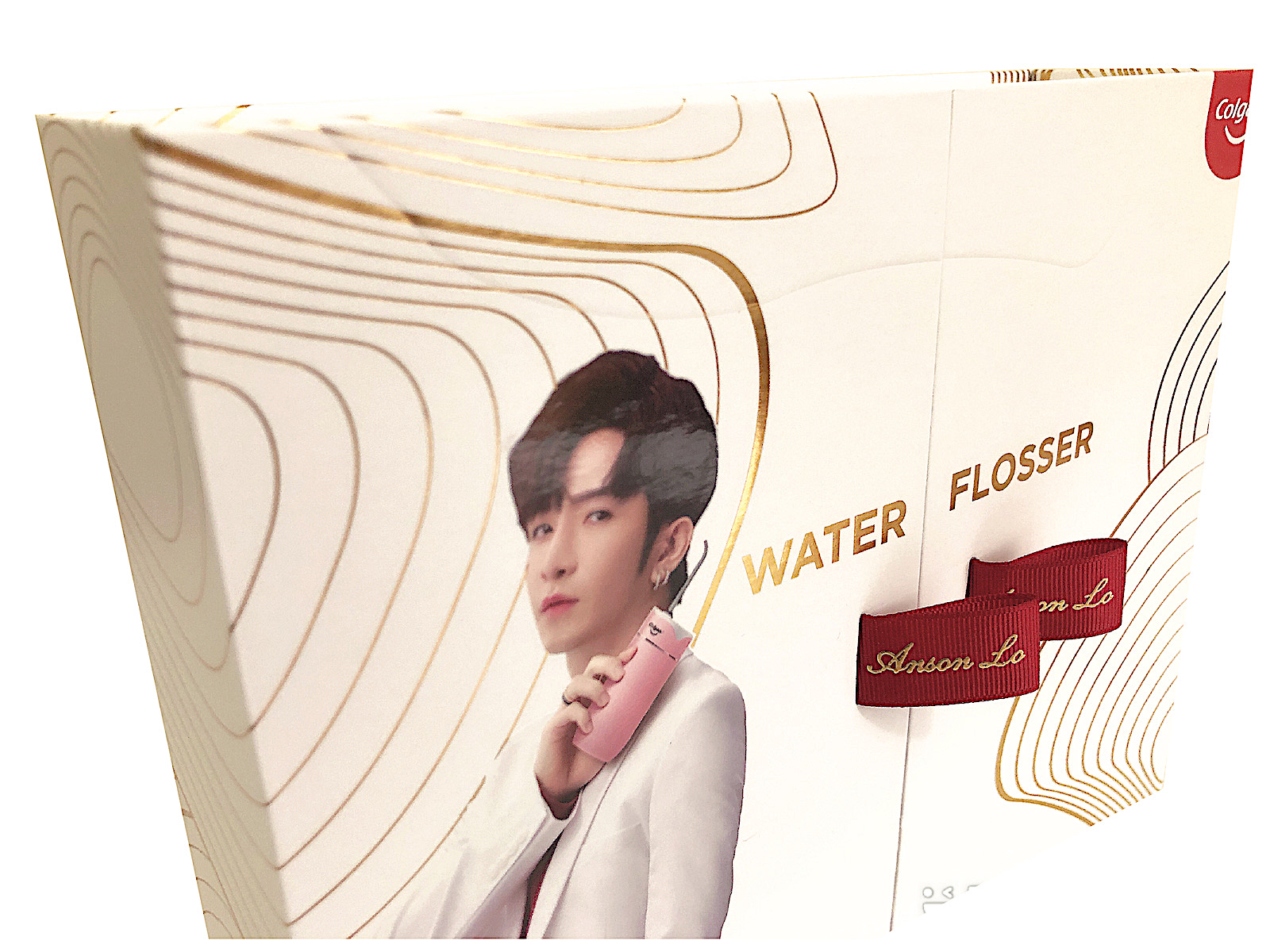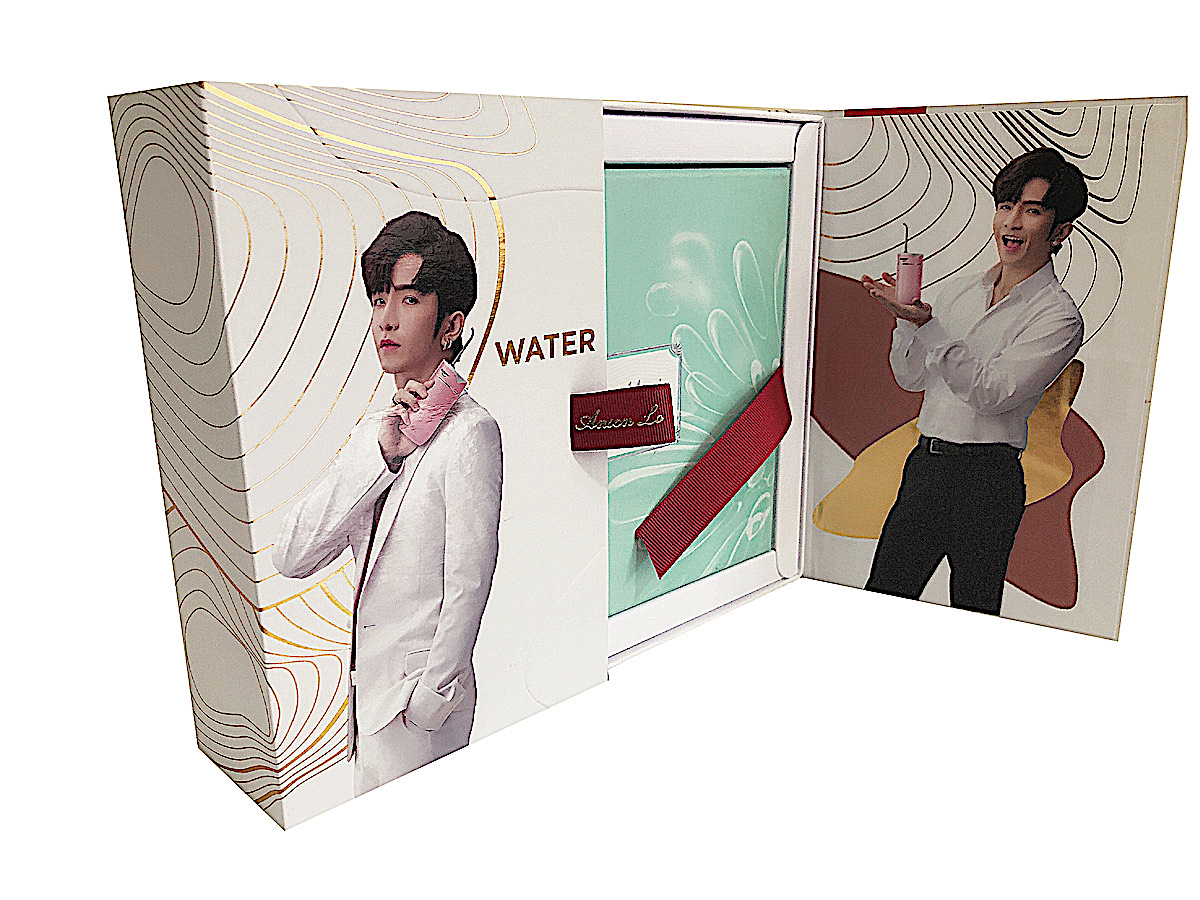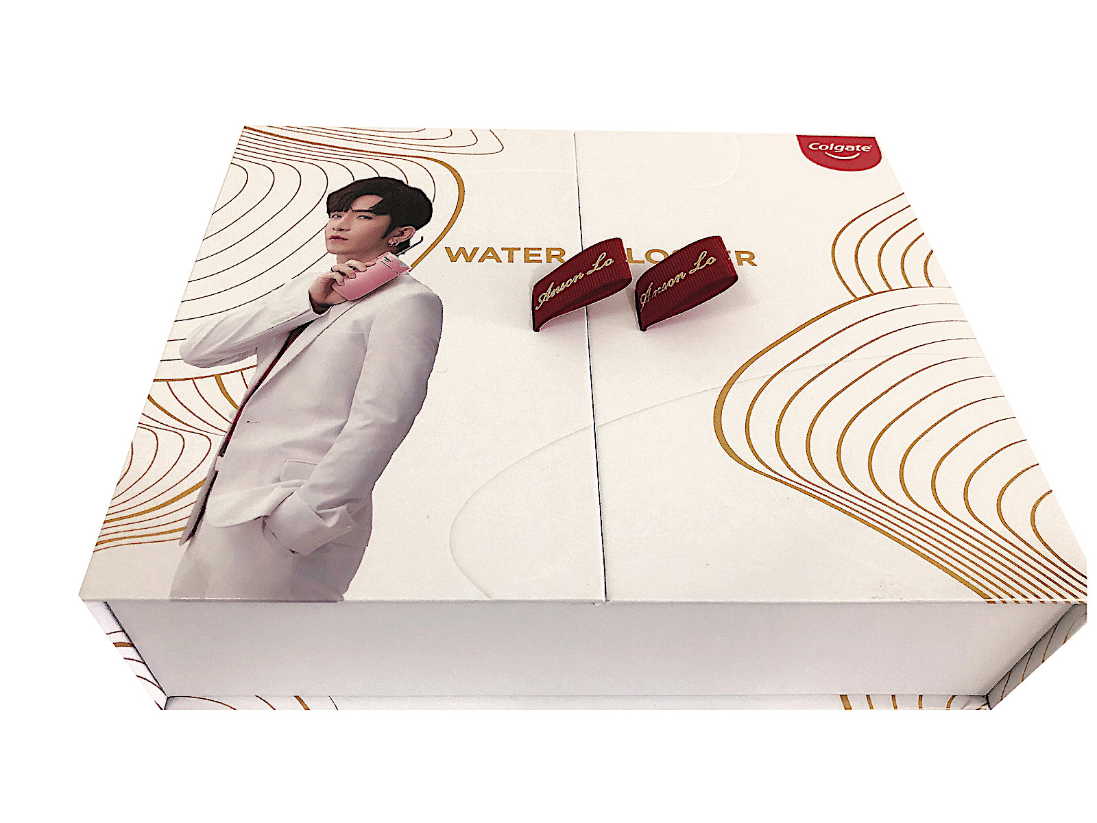 The box is made by 157 gloss paper mounting with 1.5mm chipboard, four colours printing with matt lamination and spot U.V. and hot stamping on front panel, attaching one pair ribbon on left and right cover. The ribbon has logo and name printed. The central tray is made by special paper/textured paper mounting with 1.5mm chipboard, and then fixed at centre of case cover.