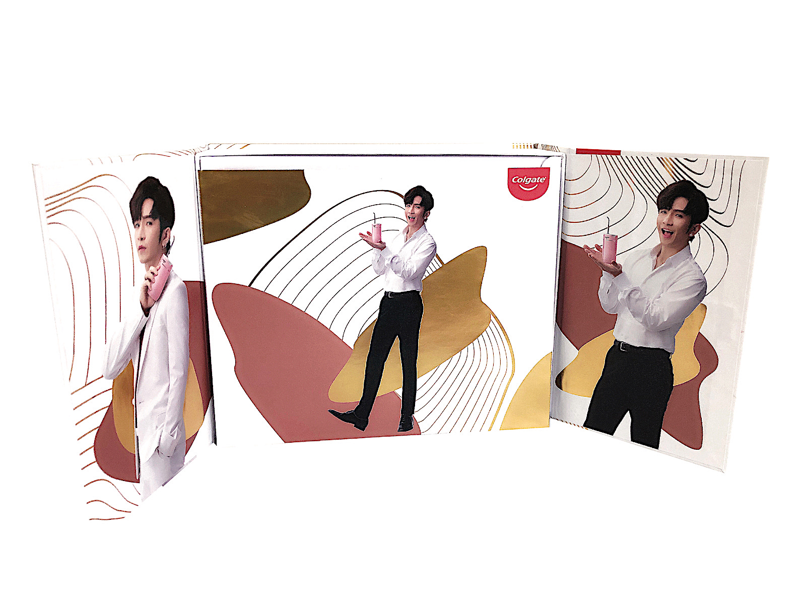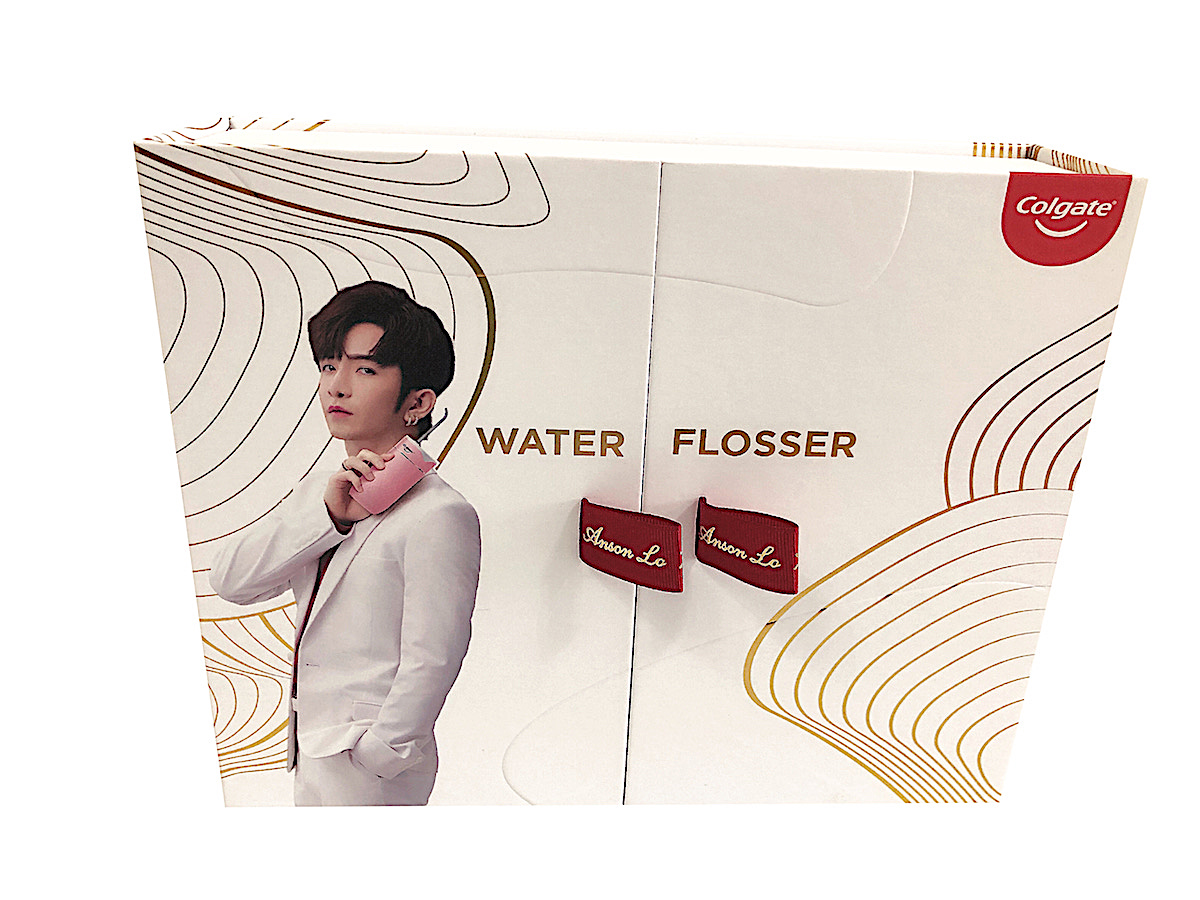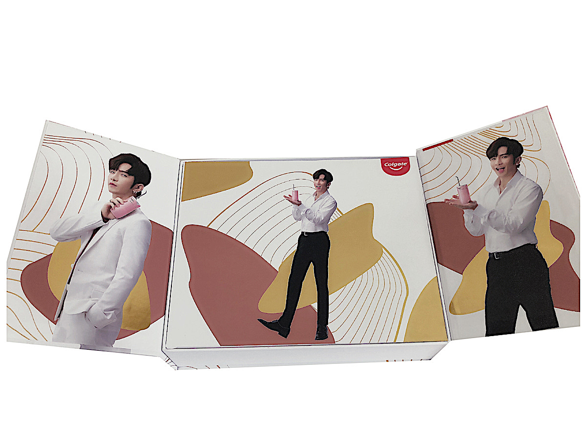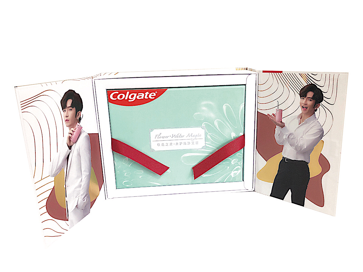 The box is made by 157 gloss paper mounting with 1.5mm chipboard, four colours printing with matt lamination and spot U.V. and hot stamping on front panel, attaching one pair ribbon on left and right cover. The ribbon has logo and name printed. The central tray is made by special paper/textured paper mounting with 1.5mm chipboard, and then fixed at centre of case cover.