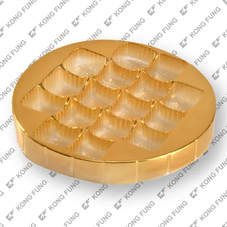 Round in shape with multiple storage compartments, this packaging tray keeps different kinds of confectioneries presentable for gifting. The gold colored plastic tailor further employs a luxurious hint of style, while depicting quality and durability for long-term use.