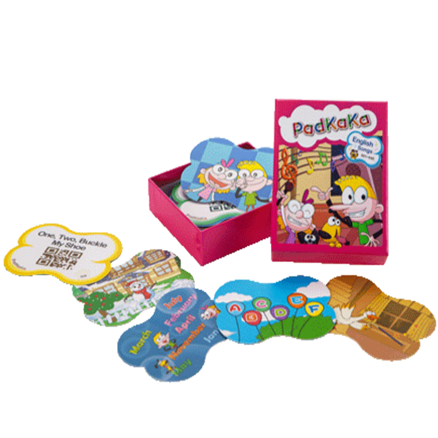 1.45 songs and 45 animations 2.English Songs 001-045 contains 45 nursery rhyme cards and 45 animations for each song. These best loved songs include Alphabet song, Ten Little Indians, London Bridge Falling Down, It's A Small World, You Are My Sunshine etc.. 3.PadKaKa vocabulary cards are made of 450P premium coated post card paper. All the cards are matted on double sides, making them water repellent and easy to clean. 4.12cm×9cm size makes it easy for children to grasp and grip. 5.All the cards are printed with soy ink (with Printed with Soy Ink logo), and the printing process is under strict control. We are trying our best to provide your baby with 100% safe and non-toxic products. 6.Each set contains: PadKaKa User Guide, 1 trial cards, and an Activation Card.
