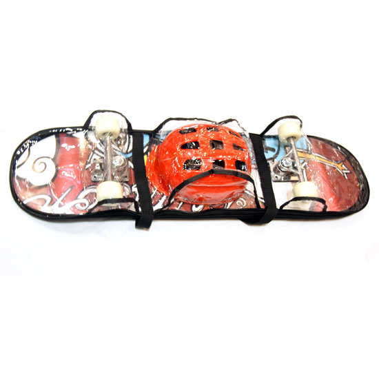 This chic skateboard is designed to offer healthy sports recreation for young people. The skateboard is fitted with four sturdy wheels to provide a smooth ride and optimal performance. It is paired with a matching helmet to protect the skateboard player.