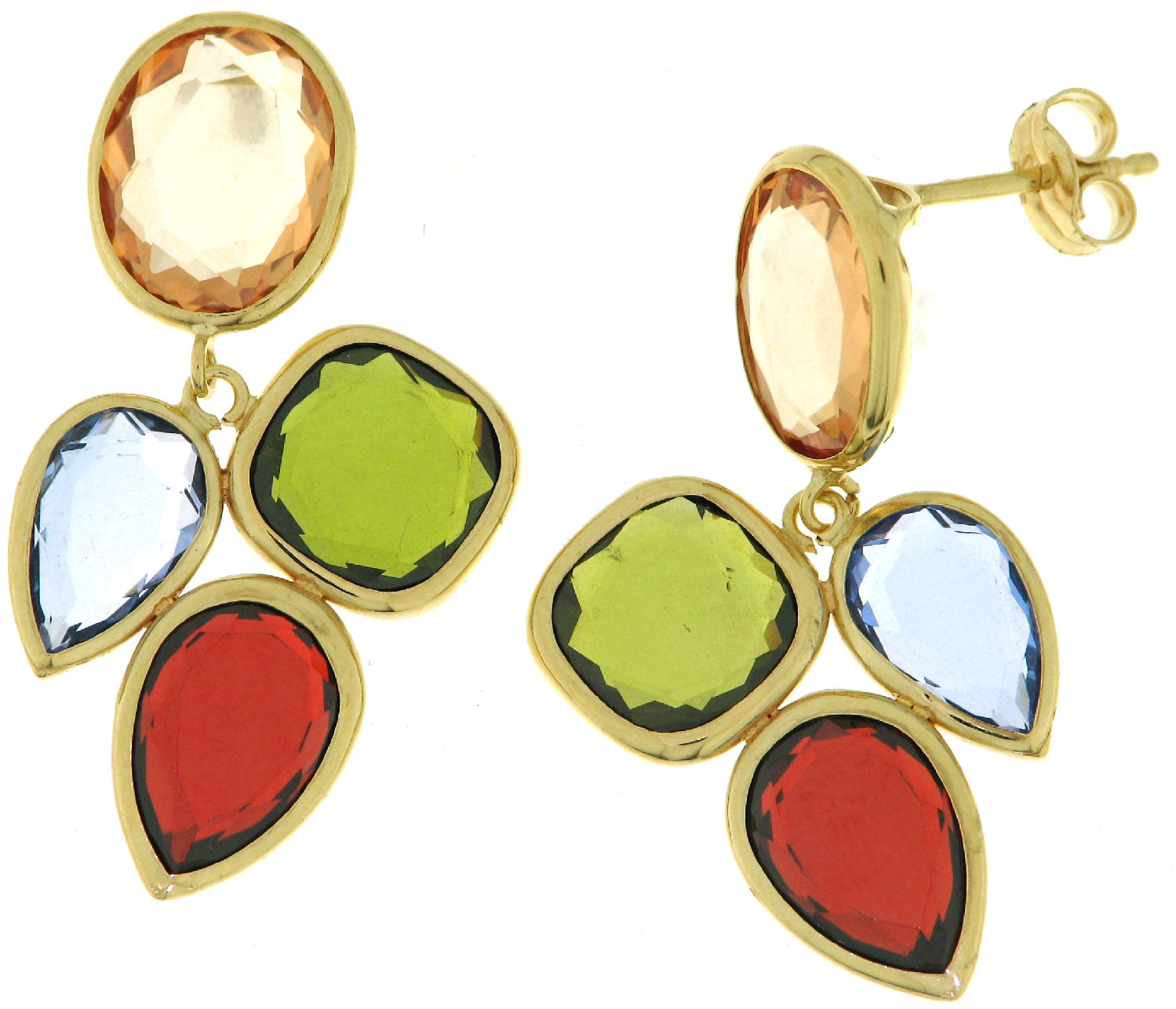 Pair Yellow Gold earrings with CZ in different shapes and colours.