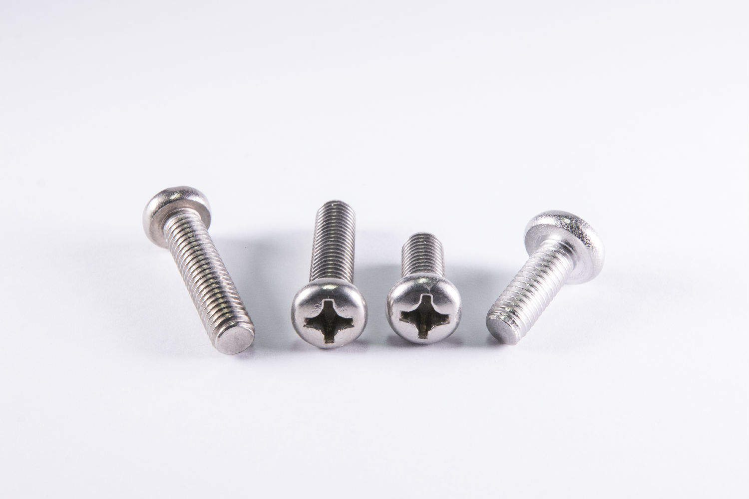 Featured here is a pan head screw with cross drive. It comes in a metallic toned exterior and has a round shaped head. This screw has a high durability and is easy to use.