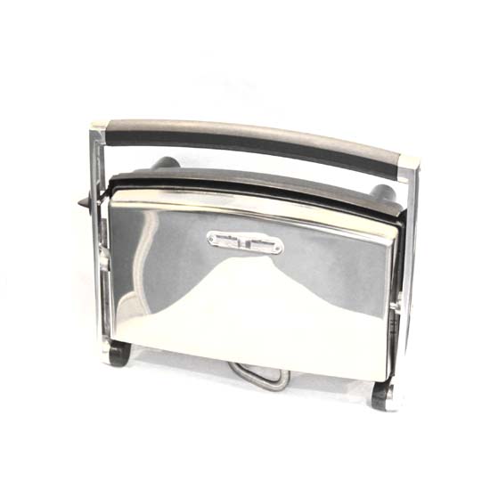 The two-slice panini press comes with non-stick coated plates for easy cleaning. Its floating hinge system automatically adjusts to the variable size of toasts, snacks or meat, while the drip tray helps capture the juice from grilling for later disposal. This panini press can also stand upright for compact storage.