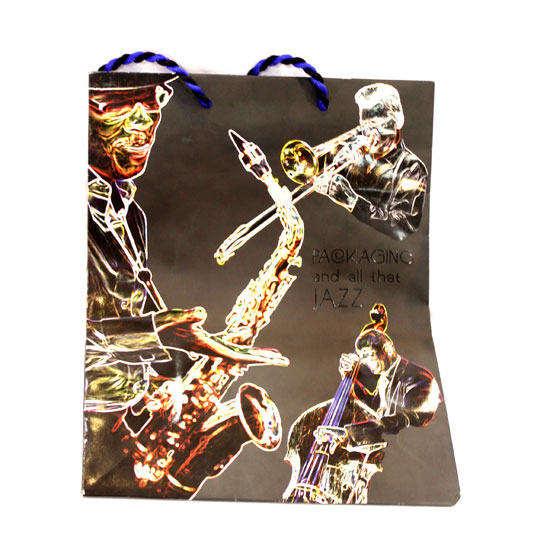 This is a nice paper bag made of stone paper. The paper bag features color prints of jazz players in a collage style. Twisted string handles are added for convenient use.