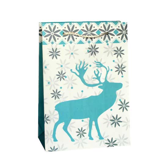 This nice paper bag features a blue deer and snowflake-like patterns for attractiveness. It is designed with carrying strings for ease of use. This exquisite paper bag is excellent for gift packing.