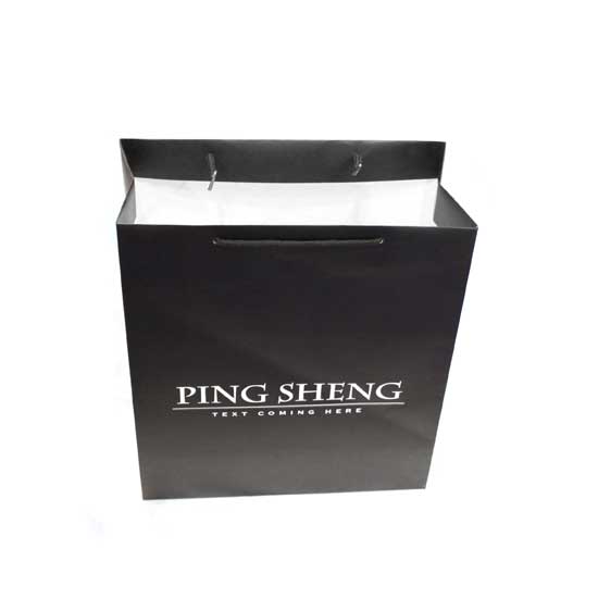 This is a paper bag that is printed with promotional logos. It is designed with double handles on top for easy carrying. This fashionable paper bag is ideal for packing different high-end items.