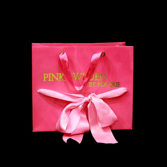 This is a printed bag that is made of high-quality paper and boasts an allover bright red color. It is designed with a fabric handle strap and a pink ribbon ornament. This stylish printed bag is highlighted by the golden-tone logo prints.