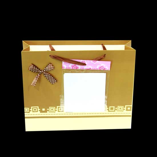 This is paper bag that is designed with a main compartment for easy storage. The ribbon bow with white dots adds a decorative touch to the look of this paper bag. This simple yet elegant paper bag is an ideal choice for you to packing gift items.