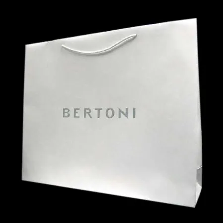 This is a paper bag that comes in allover white for a neat and clean appearance. It has durable top handles for easy and convenient carrying. The text print on the bag adds a touch of style to the whole piece.