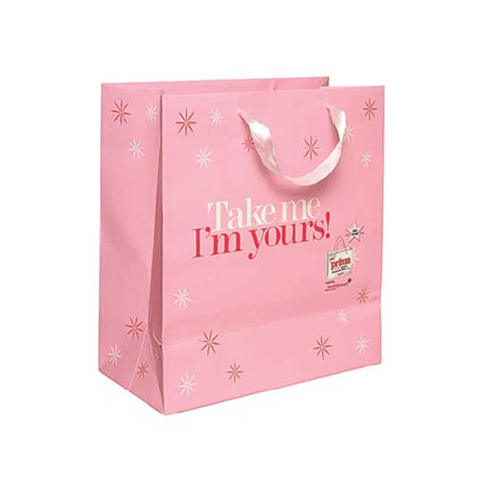This is a paper bag in sweat pink. It is printed with exquisite patterns for added elegance. This bag is designed with two ribbon handles in light pink.