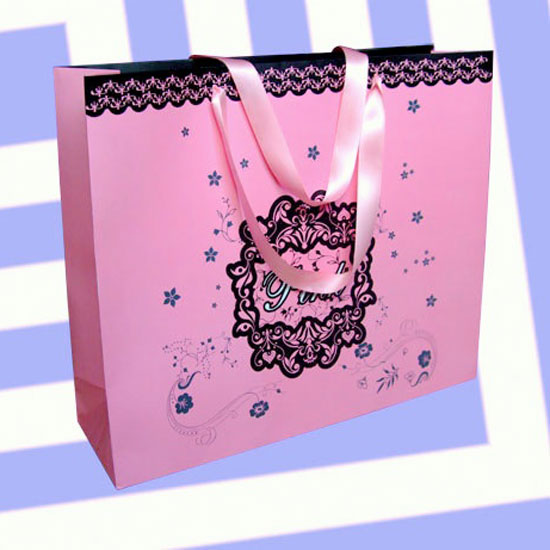 This pinkish paper bag is made with a varnish finish and trimmed with lace-like details for an elegant look. The ribbon handles are carefully designed for an extra dose of femininity. The bag is suitable for packing gourmet gifts or clothing items.