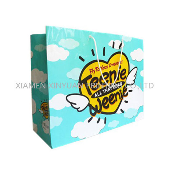 This paper bag comes with cloud patterns and a heart image in the middle. It is printed with vivid colors and intricate details. The quality materials and well designed handles make this bag stand out from the rest.