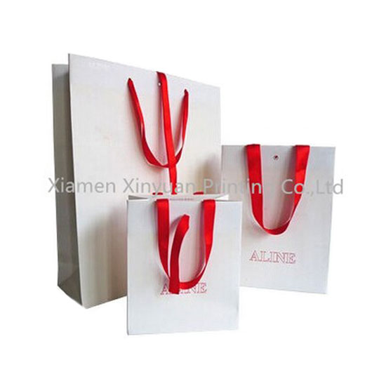 This paper bag comes with a white finish. It is accented with ribbon handles for a classy touch. It is made of quality ivory cardboard for long lasting and repeated use.