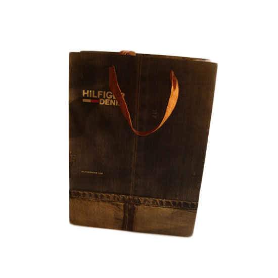 This is a paper bag with a jean-like appearance. It is made of high-quality material in a rectangular shape. This bag is a great choice for packaging modern jeans.