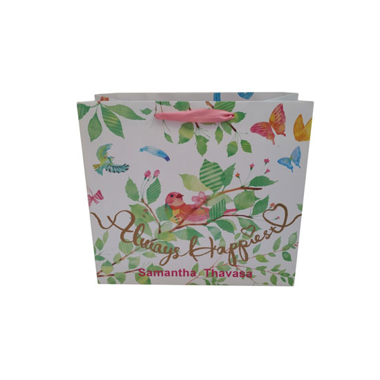 This is a bag made of robust paper. It features a white background with beautiful patterns in bright colors. This bag is completed with sturdy handles for easy carrying.