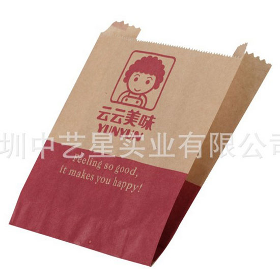 This is a paper bag with a two-toned design. The high-quality material is safe for packaging foods. You logo and design can be printed on it for promotional use.