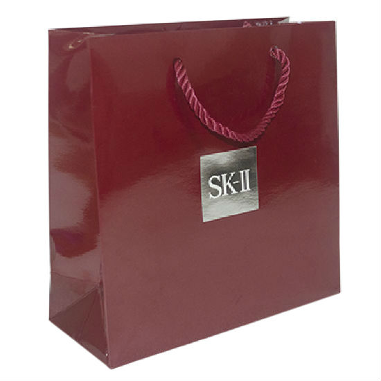 This paper bag features a broad base with side gussets to hold a variety of commercial products. Two top handles are integrated for comfortable carrying in the crook of your arm. With the brand name printed on the front, this paper bag is perfect for retail and advertising use.