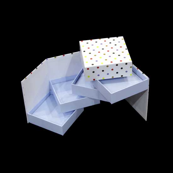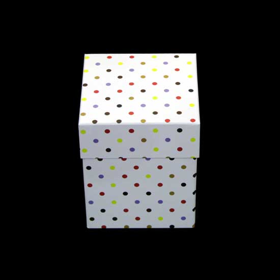 This exquisite box features a white surface with a colorful dot pattern. The well-designed box has multiple tiers in the inside. The sturdily constructed paper box guarantees a long lifespan.