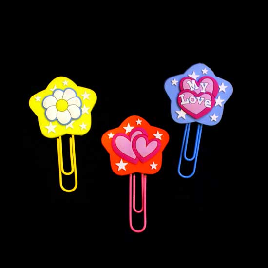 This is a paper clip with a cute and lovely design. It features a plastic embellishment in a star shape that is adorned patterns with in bright colors. This clip is available in different designs for you to choose from.