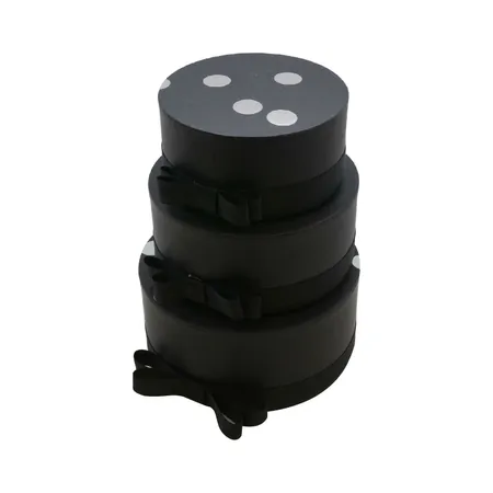 Accented with silver foil printing dots, this 3-piece paper gift box set basks in solid black to deliver chic presence. The circular profile further details grosgrain ribbons for enhanced appeal. It is not only a packaging box, but a wonderful storage for everyday knick-knacks.