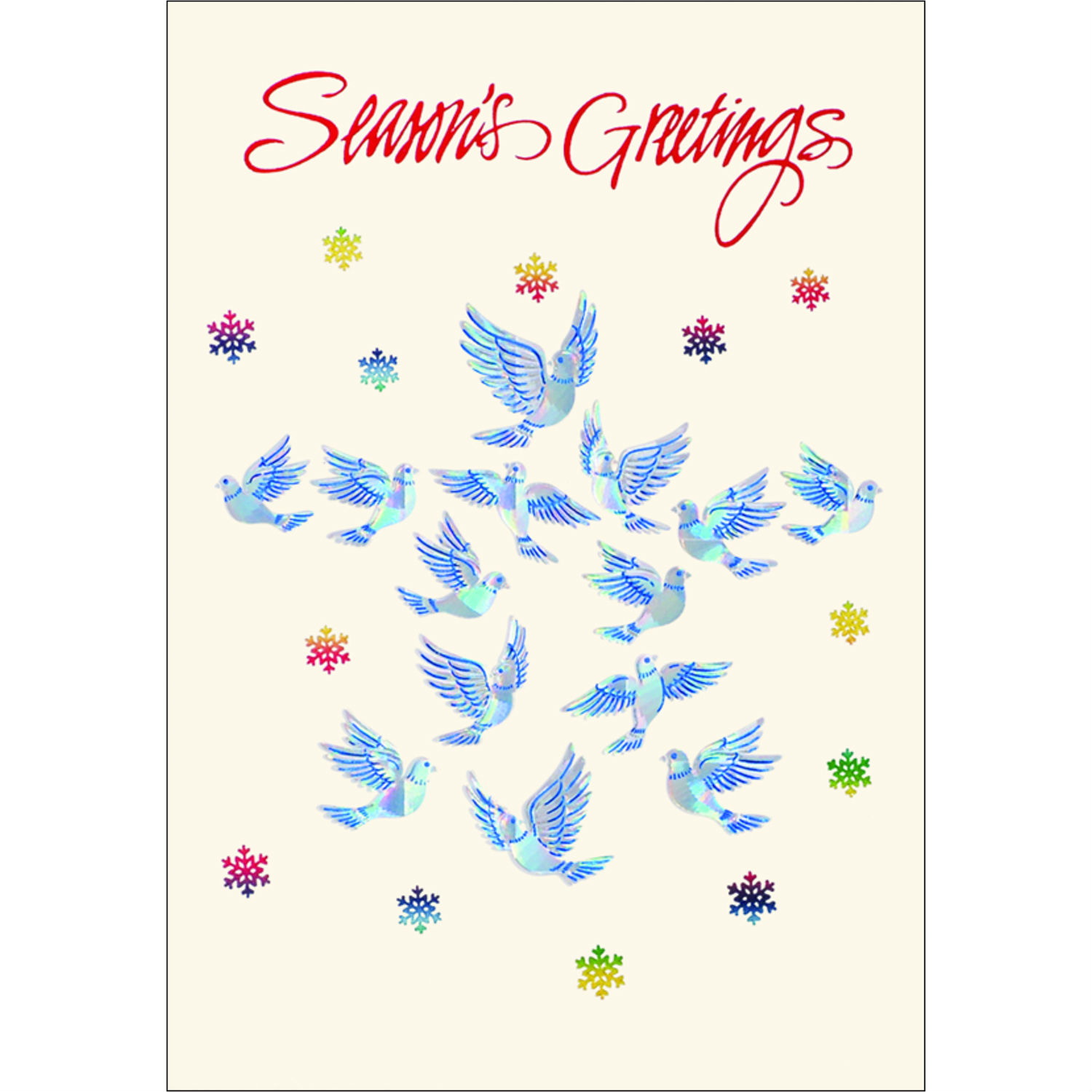 Embossed with lively flying pigeons with colorful allover snowflakes.