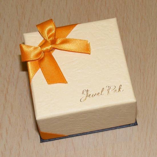 This is a paper jewellery box for packaging and wrapping fine jewellery or costume rings or earrings. The square box has a beige cover printed with logo at the bottom, and is decorated with an orange ribbon bow on the top left hand corner.