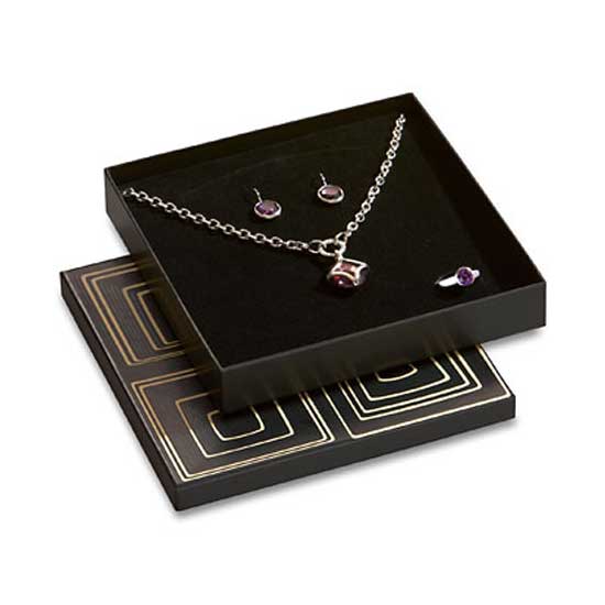 This paper jewelry box is made of glossed cardboard paper for added waterproof quality. The modern pattern is subtle and stylish. This jewelry box is capable in holding and protecting jewelry sets securely.
