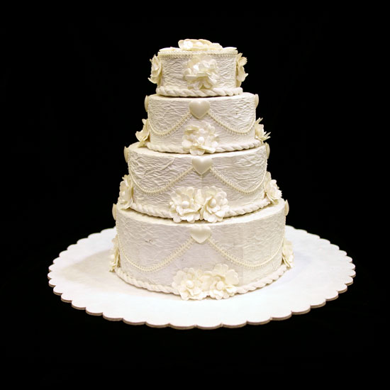 Photographed is a paper handmade gift box in the shape of a wedding cake. The paper wedding cake is made with high-quality paper in pale colors and textures. It makes a nice decoration on the reception desk of a wedding venue.