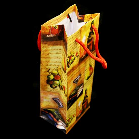 This wine bag is made of art paper with alluring fruit and wine printings. It is attached to durable handles for easy carrying. There are various designs available for your selection.