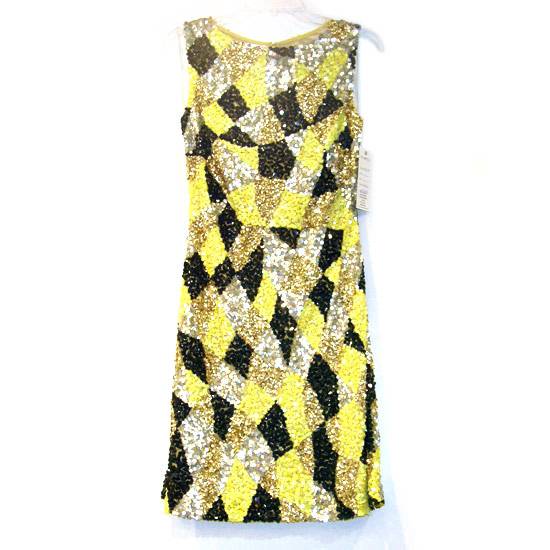 This is a party dress for women. The dress has shiny sequin sewed all over. It is in irregular geometry pattern in yellow, silver, gold and black.