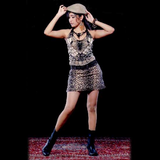 This fetching hand-embroidered party dress will surely steal the spotlight from the crowd. The flattering spider-web patterned bodice matches the alluring leopard-print mini bottom nicely. This sassy hand-embroidered party dress pairs well with black boots for a wild yet chic look.