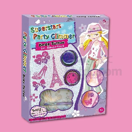 Highlighted here is a glitter box for making body tattoos. It includes glitters in different colors with rub on stencils and a brush. It makes an excellent toy for parties and is easy to apply and remove.