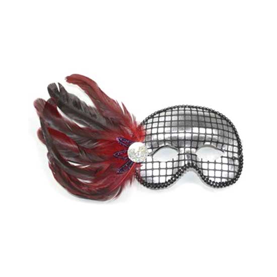 This party mask boasts a charming and eye-catching design. It is designed in silver with black check patterns. This mask is adorned with smooth feathers on the right side for added uniqueness.