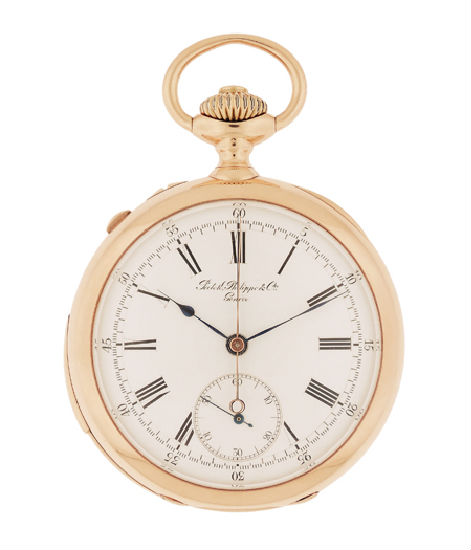 Patek philippe rare 18k yellow gold open-face minute repeating split second chronograph pocket watch with box, substitute dial, glass, and spring, c.1893