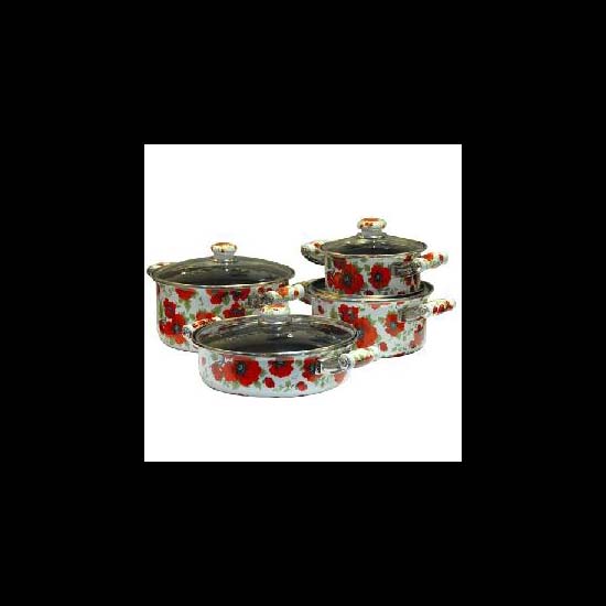 This patterned cooking utensil set consists of three casseroles, a sauce pan