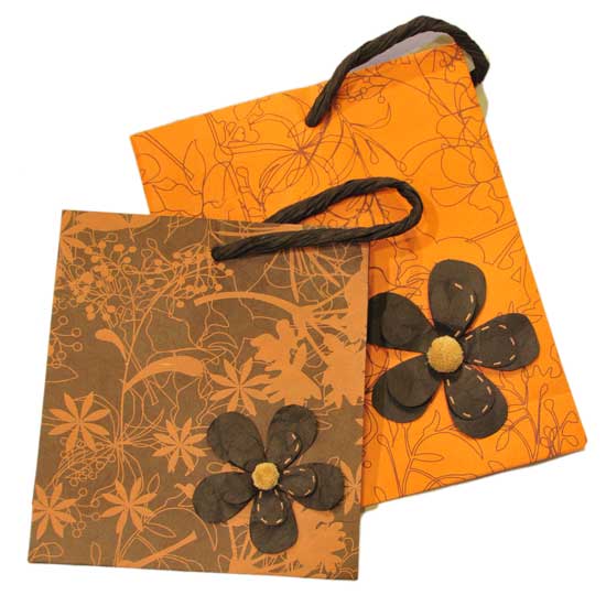 This paper bag boasts a cheerful design for gift presentation. It is made of natural handmade paper printed in orange. A delicate paper flower is added at the corner to showcase a lovely design.