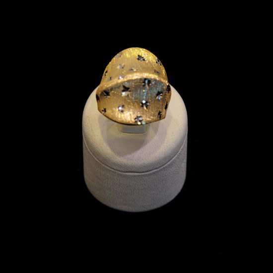 This decorative patterned ring features a textured surface with star-shaped cuts. This beautiful ring boasts a lovely and sweet design that appeals to young girls. This charming ring is a fascinating addition to your collection of jewelry.