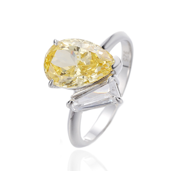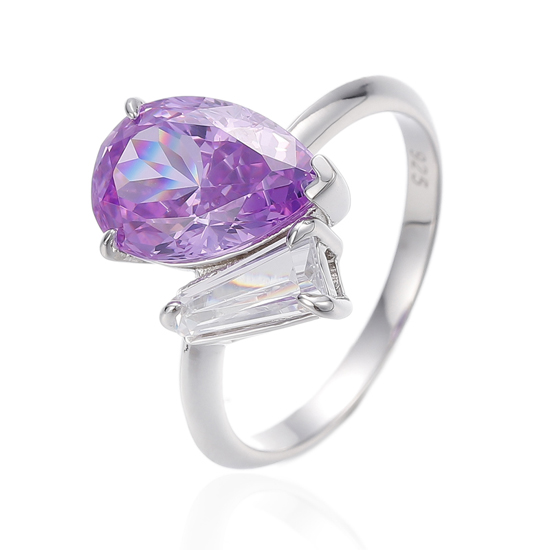 Pear Shape Kunzite And Tapered White Cubic Zircon Rhodium Silver Ring