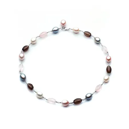This is a pearl and quartz necklace for ladies and women. It is threaded with twelve pieces of rice pearls in between rose and smoky quartz beads, creating a simple yet elegant which is great for every lady to match leisure and office wear.