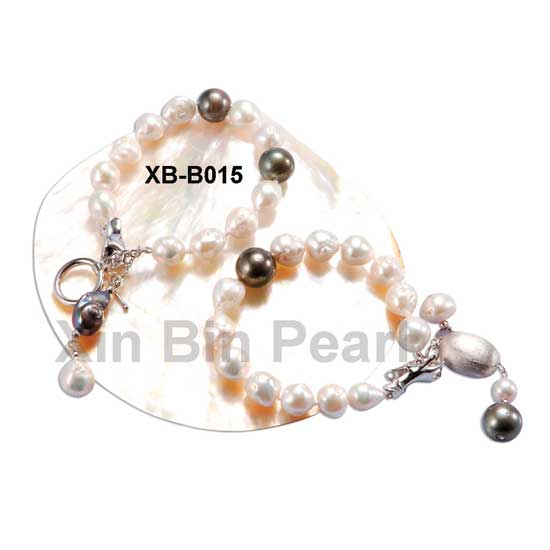 This fancy pearl bracelet uses irregularly shaped pearls in peacock green, white and off-white. The dangling accents bring a more feminine touch to the design. The pearl bracelet goes well with different styles easily.