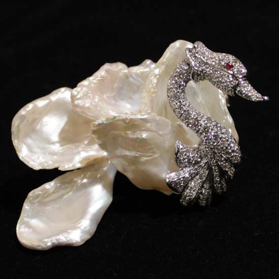 This elegant brooch flaunts a lively swan. Its abstract body comes with pearl which shines brightly. The neck and the head come with numerous dazzling diamonds. The eyes feature a ruby for added style. This exquisite brooch makes a stunning accessory.
