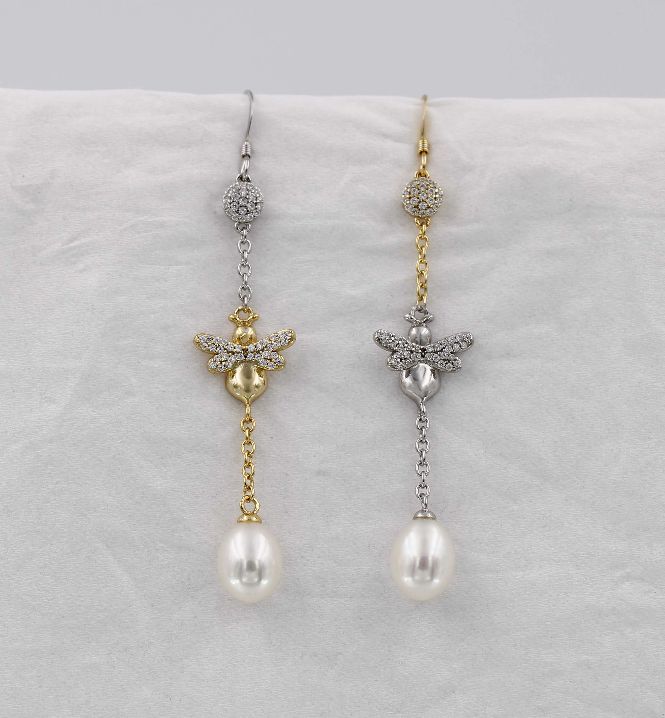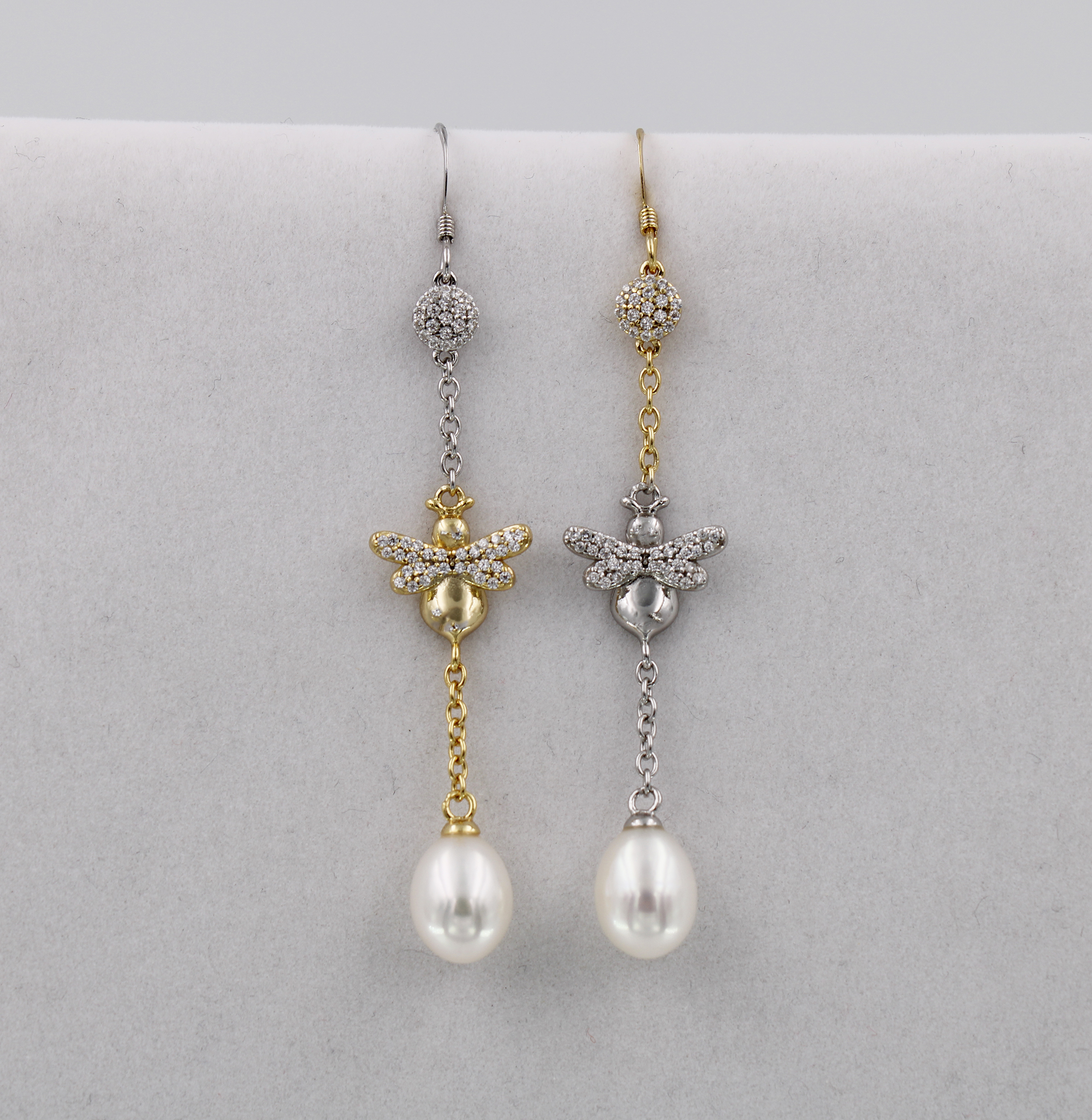 • Fish hook earring hanging 2pc. of 1cm length chain, & 12.5mm bee charm with CZ, & 8-8.5mm F.W.Pearl drop shape in white, all metal are 925 s/s in 18K gold plated & rhodium plated in opposite position, free of nickel.