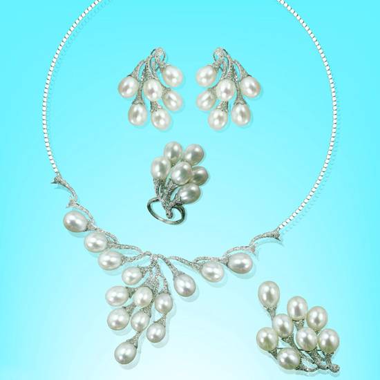 This set of jewellery includes necklace, earrings, rings and pendants. All of them feature at least six pearls. They are generally in a symmetric design, although not perfectly. Those pearls have teardrop shape in silver colour. The distribution of the pearls are bouquet-like, making the design like some hanging fruits on the tree.