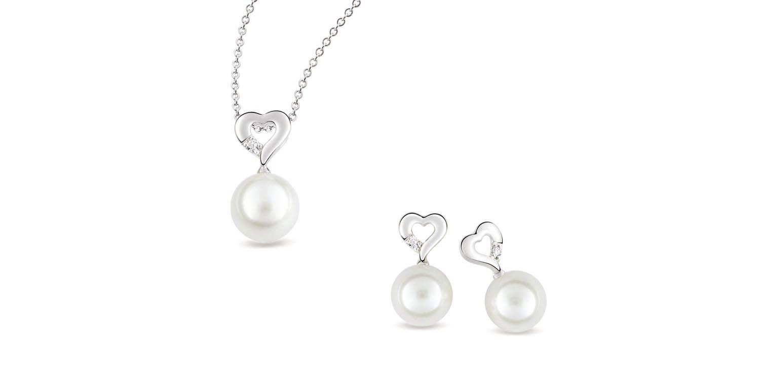 The exquisite pendant features a gold heart with diamond on one edge, linking a pearl underneath.