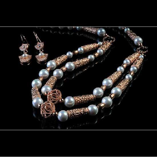 This pearl jewelry set features a necklace and a pair of earrings in elegant design. The golden brown necklace is beaded with stunning lustrous pearls. Each of the earrings in the same color is set with a glamorous pearl, showcasing an exquisite design.