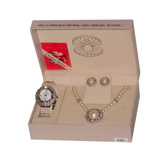 This pearl jewelry set includes a wristwatch, a pair of earrings and a necklace with a matching design. The lustrous round pearls in a natural color accent each piece. This jewelry set is an ideal addition to complete your fashion collection.