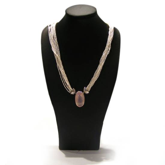 This is a pearl necklace with a pink rose quartz. The oval pink rose quartz is connected to multiple strands of white Keshi pearls. The necklace is decorated with white diamonds.