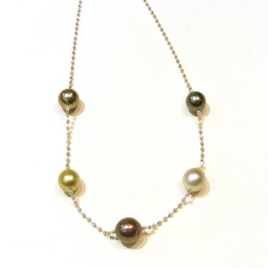 The featured item is a pearl necklace with metal chaining. The necklace comes in ball chain and is set with pearls of different colours at various sections.