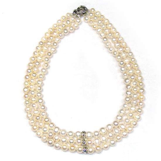 The featuring jewellery is a pearl necklace for ladies and women. The triple strand necklace is strung with round white pearls, presenting a classic and elegant style.